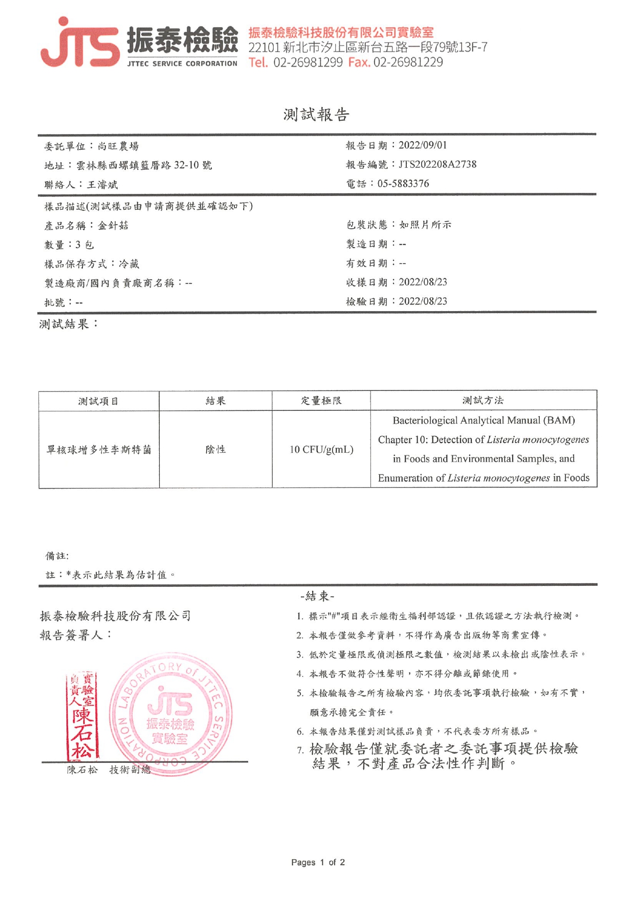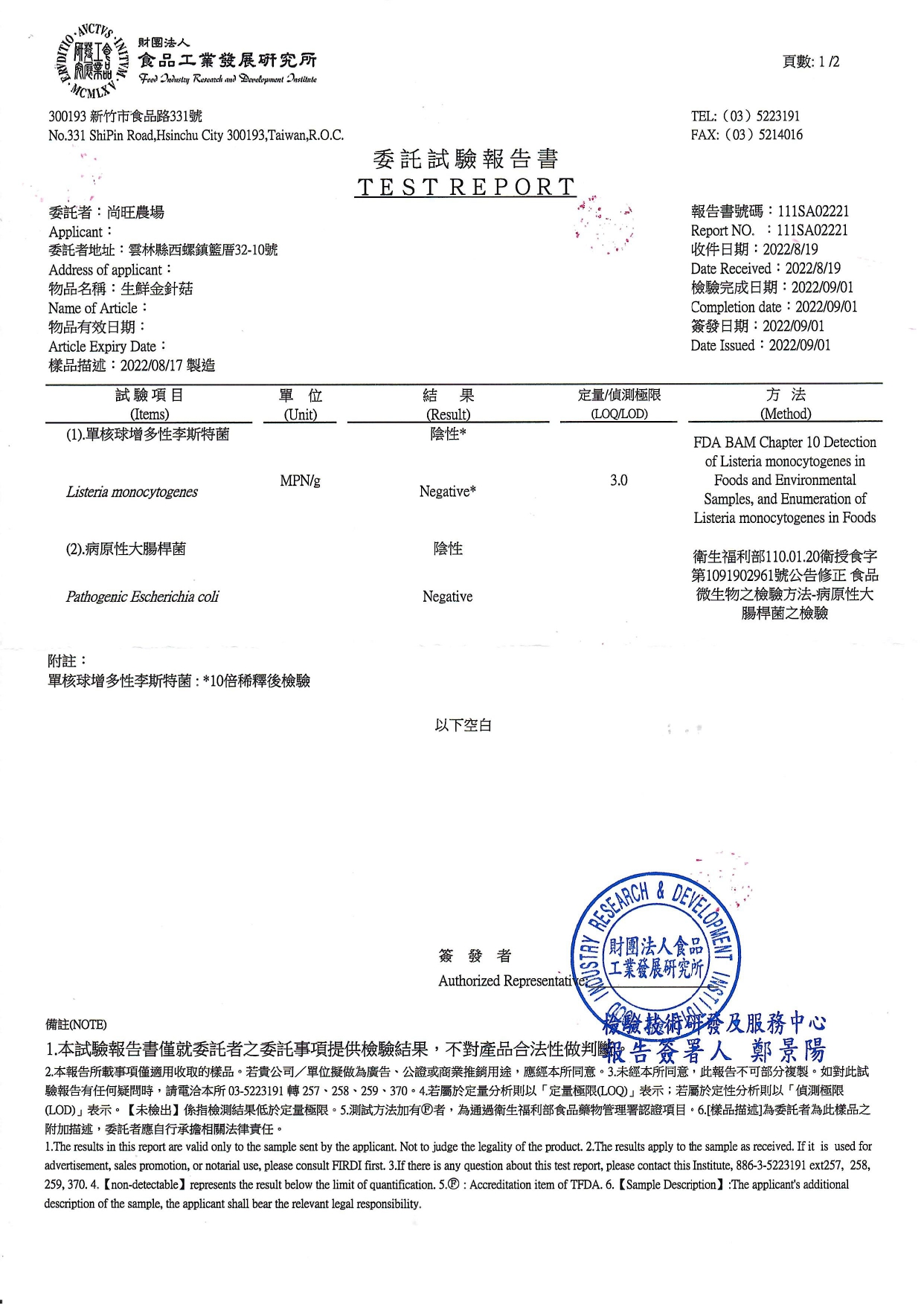 9/1 美規 李斯特菌 及 病原性大腸桿菌 檢測報告